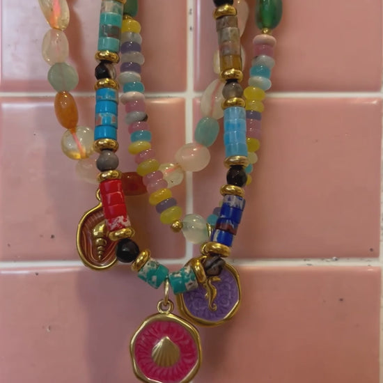 Slow made with gemstones, crystals, 18k gold plated and vintage glass beads.